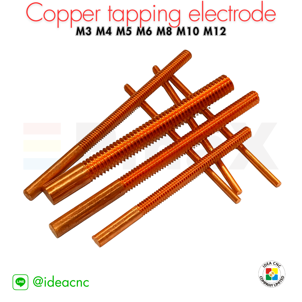 Copper Tapping Electrodes for Spark EDM Thread Electrode เป็นอิเล็กโทรดเกลียวทองแดงสำหรับใช้กับเครื่อง Spark EDM / EDM Tapping เพื่อกัดขึ้นรูปเกลียวภายใน (Internal Thread) ด้วยกระบวนการ EDM เหมาะสำหรับชิ้นงานที่ขึ้นเกลียวด้วยวิธีต๊าปปกติได้ยาก เช่น เหล็กชุบแข็ง ชิ้นงานแข็งพิเศษ หรือรูขนาดเล็กที่ต้องการความเที่ยงตรงสูง